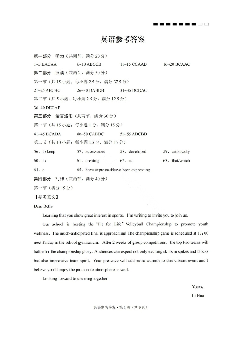 云南省云南师大附中2026届高考适应性月考卷(一)英语答案