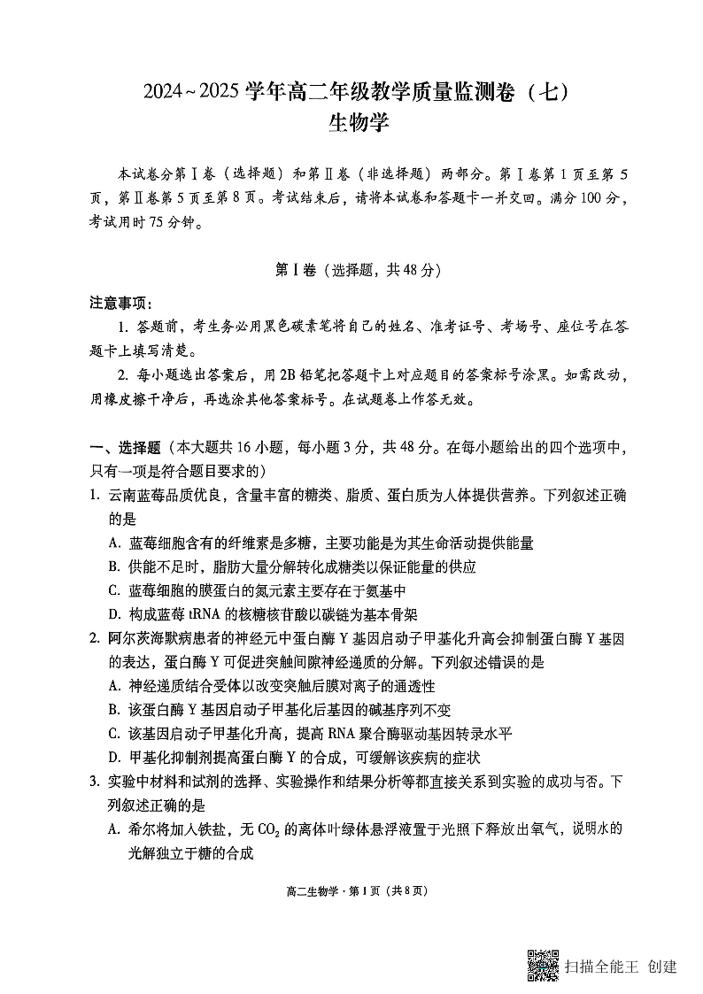 云南省云南师大附中2026届高考适应性月考卷(一)生物