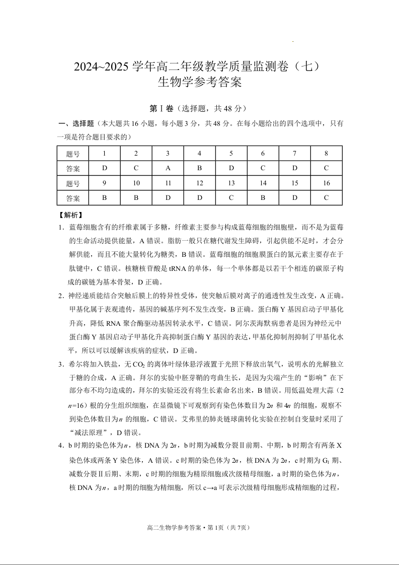 云南省云南师大附中2026届高考适应性月考卷(一)生物答案