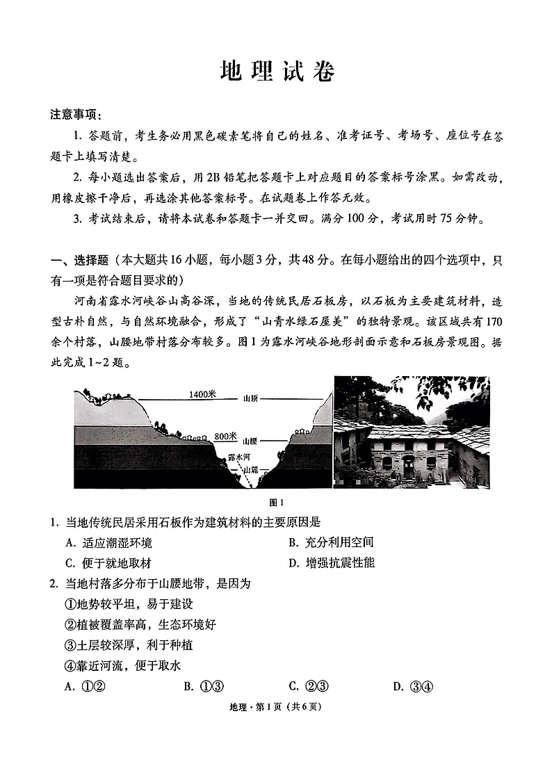 云南省云南师大附中2026届高考适应性月考卷(一)地理