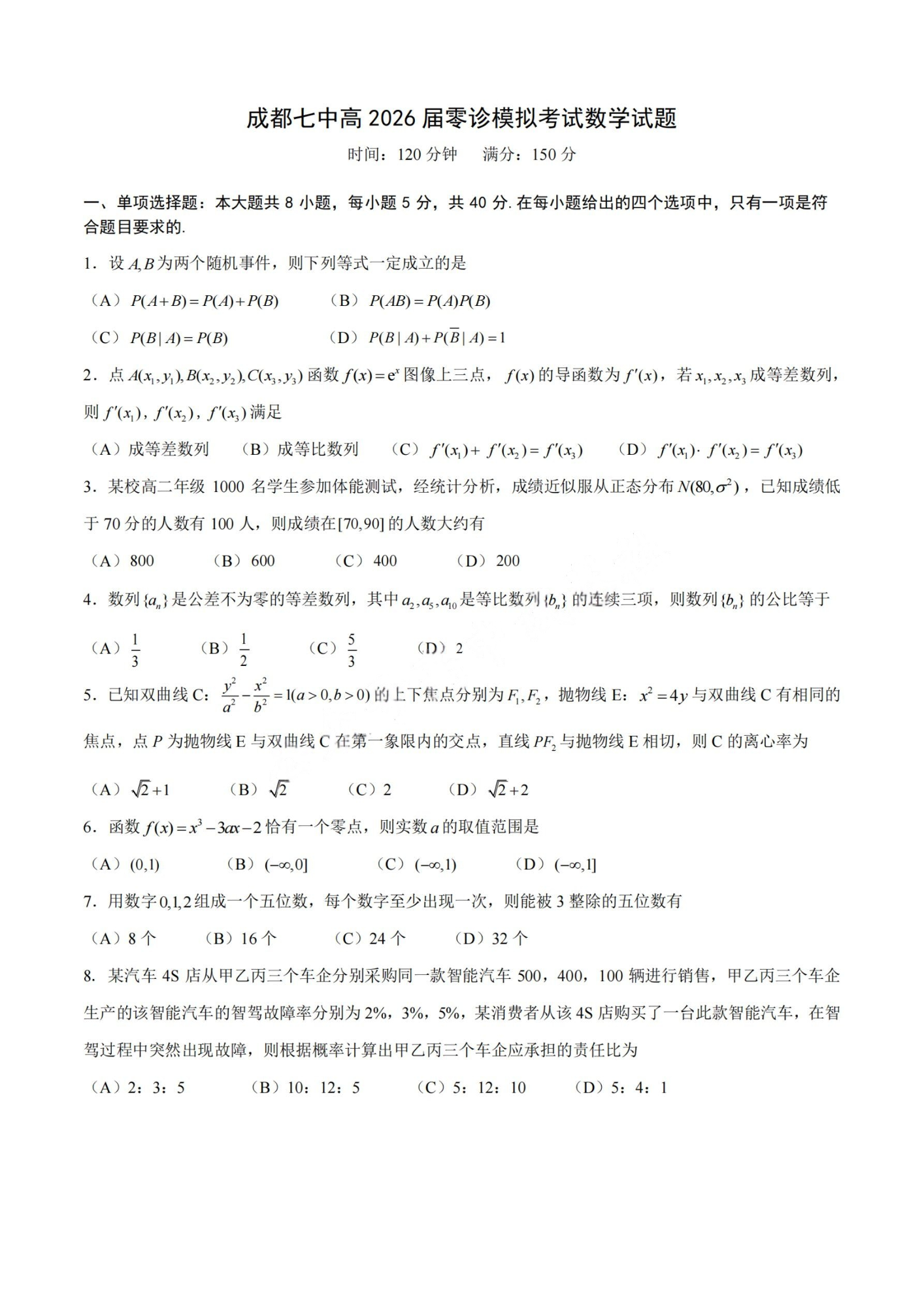 四川省成都七中2024-2025学年度下期高2026届零诊模拟考试数学