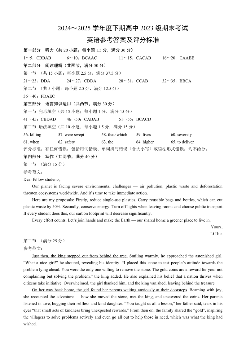 四川省成都市蓉城名校联盟2024-2025学年高二下学期期末考试英语答案