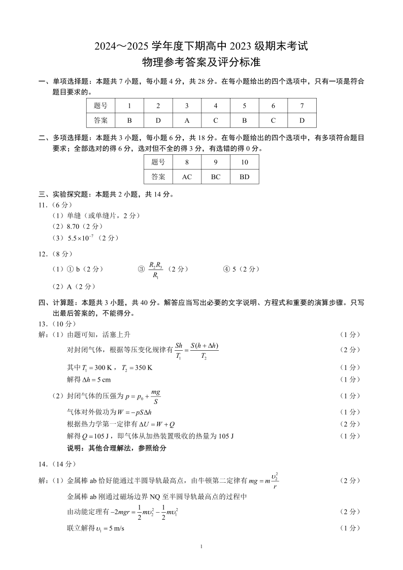 四川省成都市蓉城名校联盟2024-2025学年高二下学期期末考试物理答案