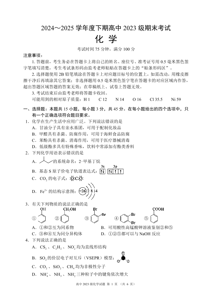 四川省成都市蓉城名校联盟2024-2025学年高二下学期期末考试化学