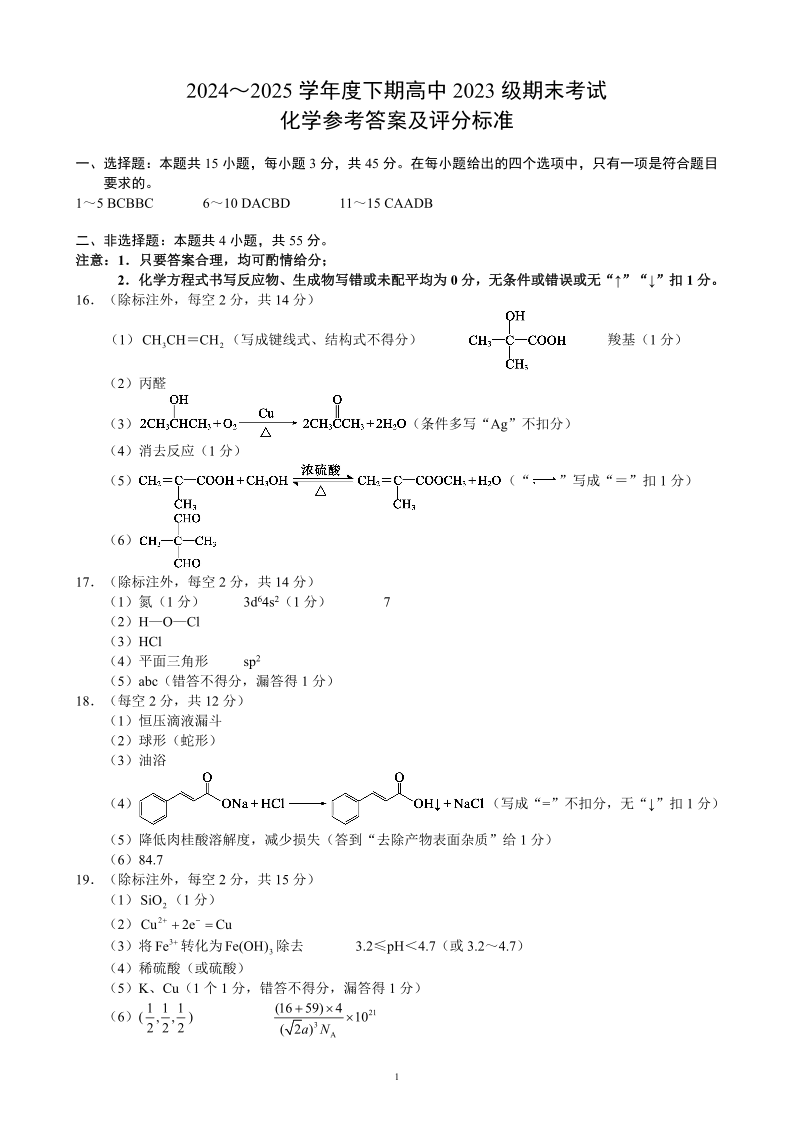 四川省成都市蓉城名校联盟2024-2025学年高二下学期期末考试化学答案