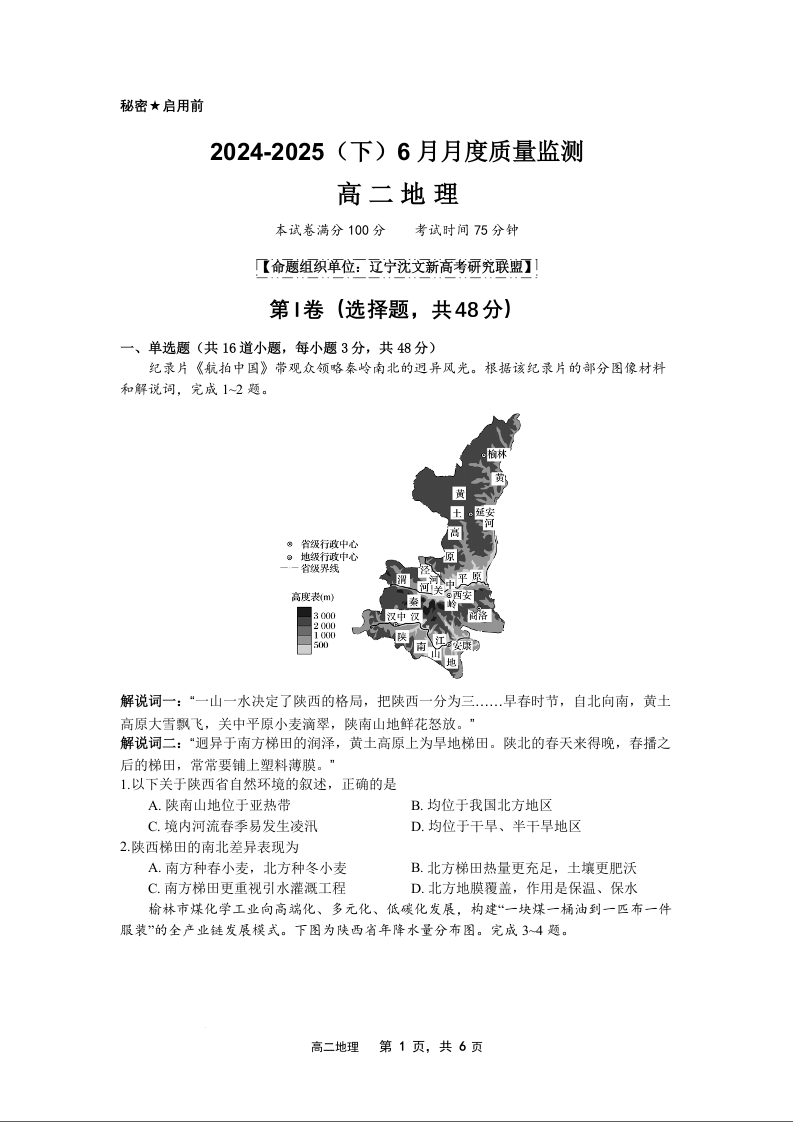 辽宁省沈文新高考研究联盟2024-2025学年下学期6月高二质量监测地理