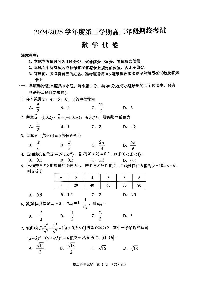 江苏盐城市2024-2025学年高二下学期期末考试数学