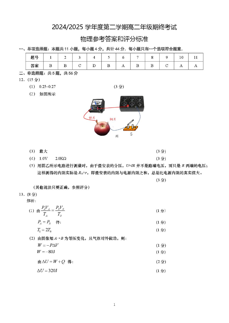 江苏盐城市2024-2025学年高二下学期期末考试物理答案