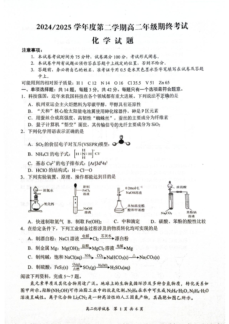 江苏盐城市2024-2025学年高二下学期期末考试化学