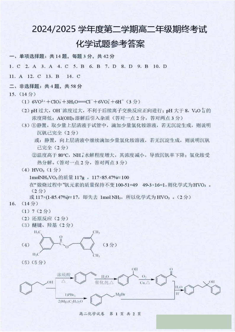 江苏盐城市2024-2025学年高二下学期期末考试化学答案