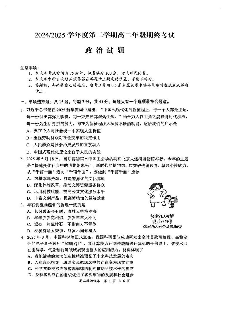 江苏盐城市2024-2025学年高二下学期期末考试政治