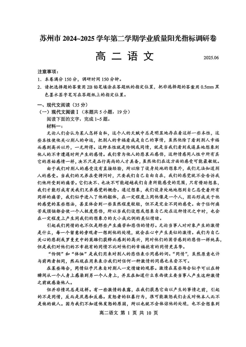 江苏省苏州市2024-2025学年高二下学期学业质量阳光指标调研语文+答案