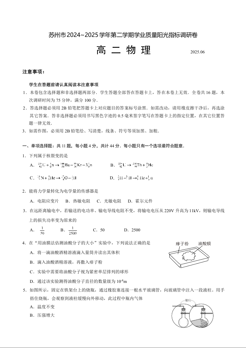 江苏省苏州市2024-2025学年下学期高二学业质量阳光指标调研物理+答案