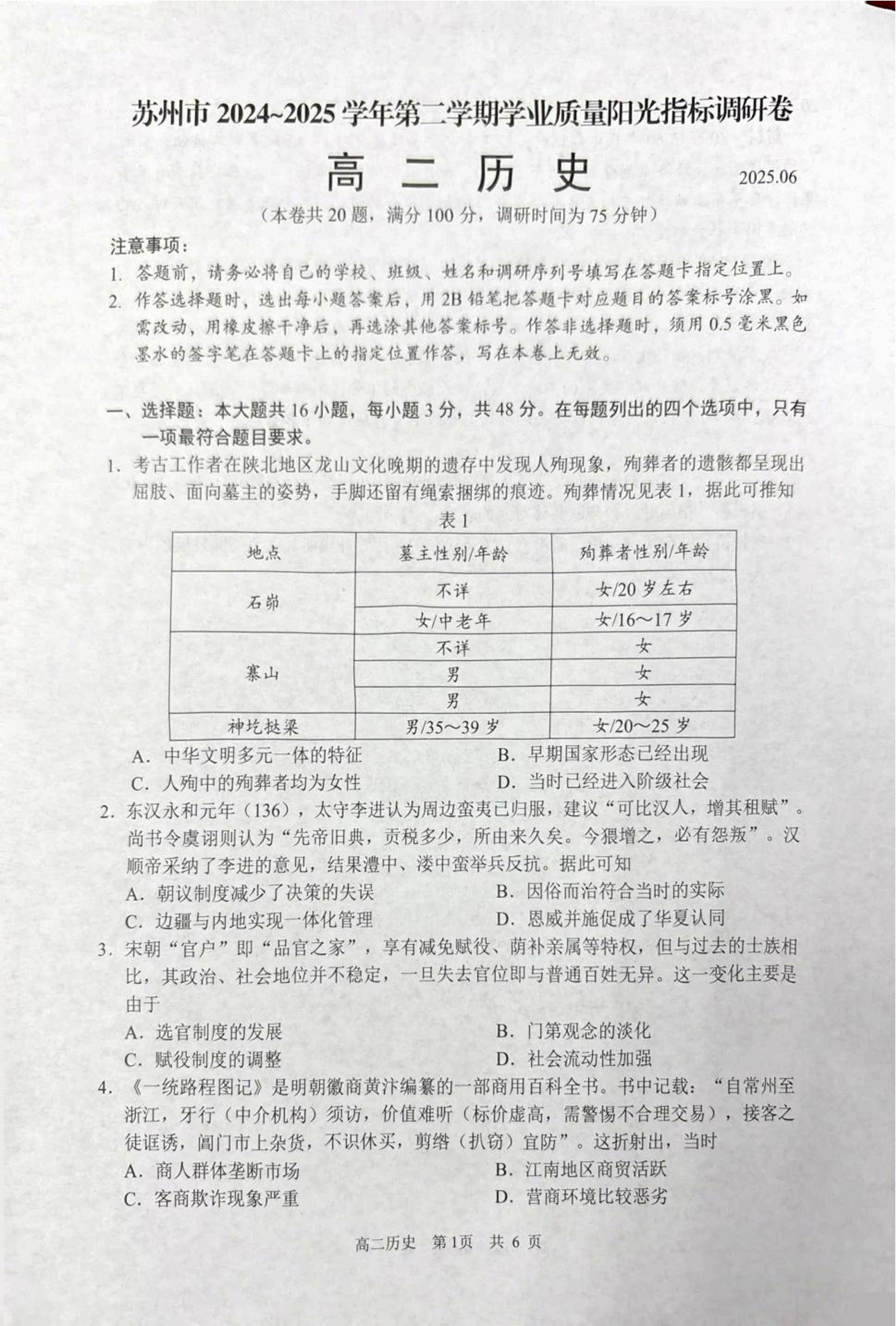 江苏省苏州市2024-2025学年高二下学期学业质量阳光指标调研历史+答案