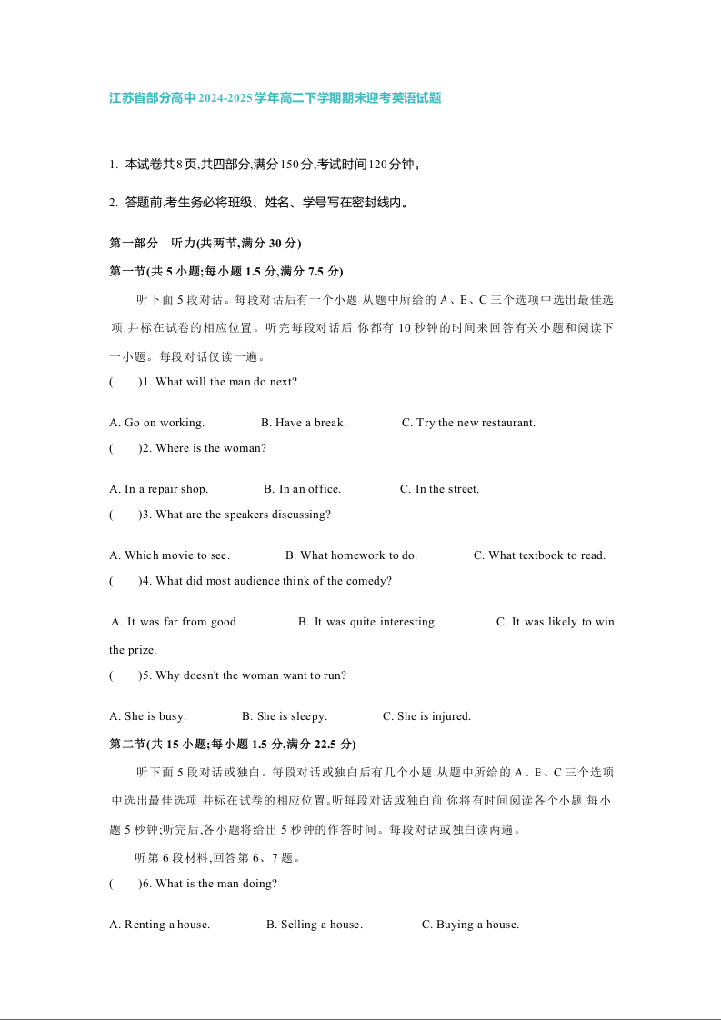 江苏省部分高中2024-2025学年下学期高二期末迎考英语
