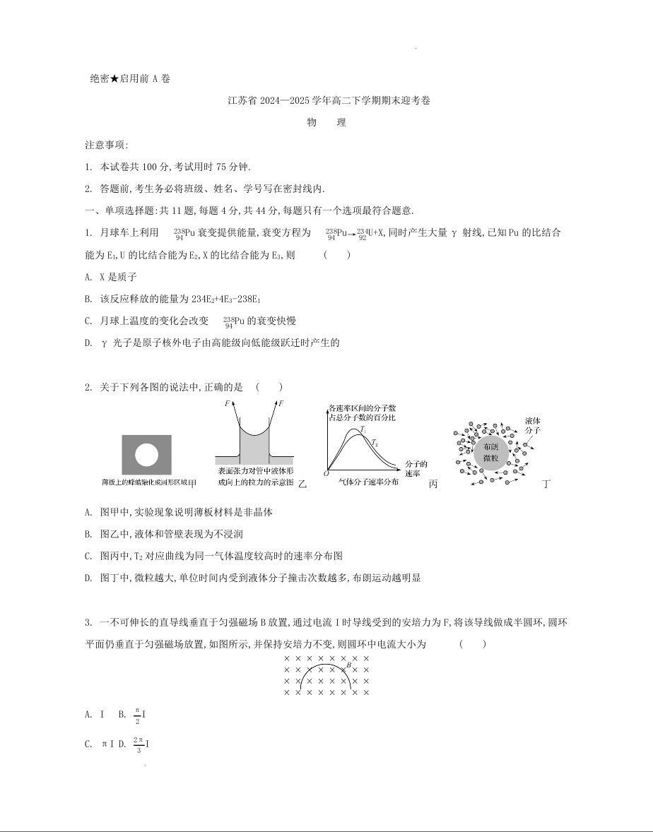 江苏省部分高中2024-2025学年下学期高二期末迎考物理