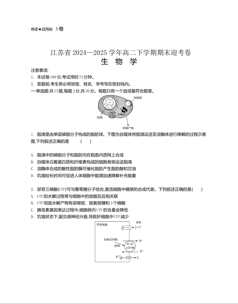 江苏省部分高中2024-2025学年下学期高二期末迎考生物