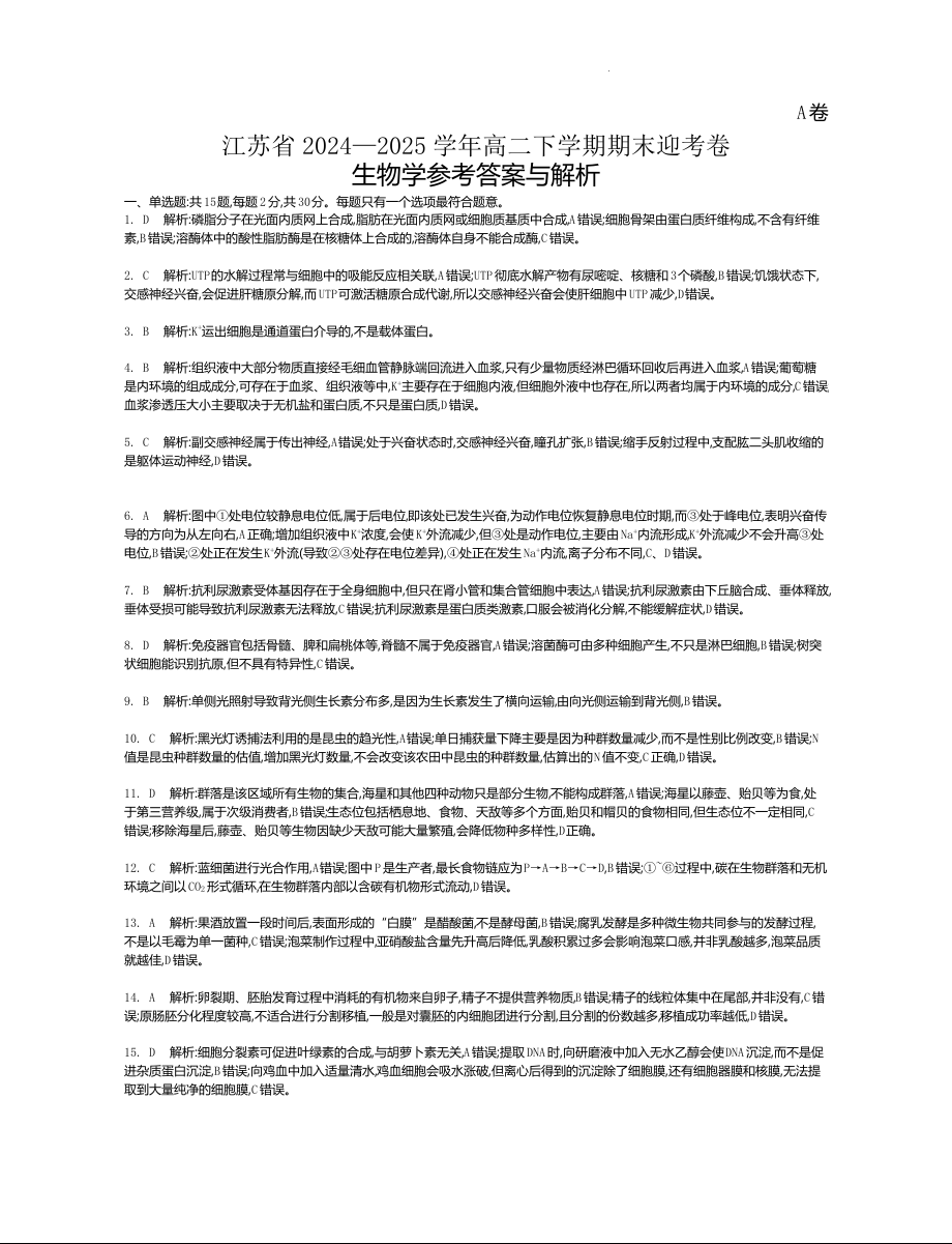 江苏省部分高中2024-2025学年下学期高二期末迎考生物答案