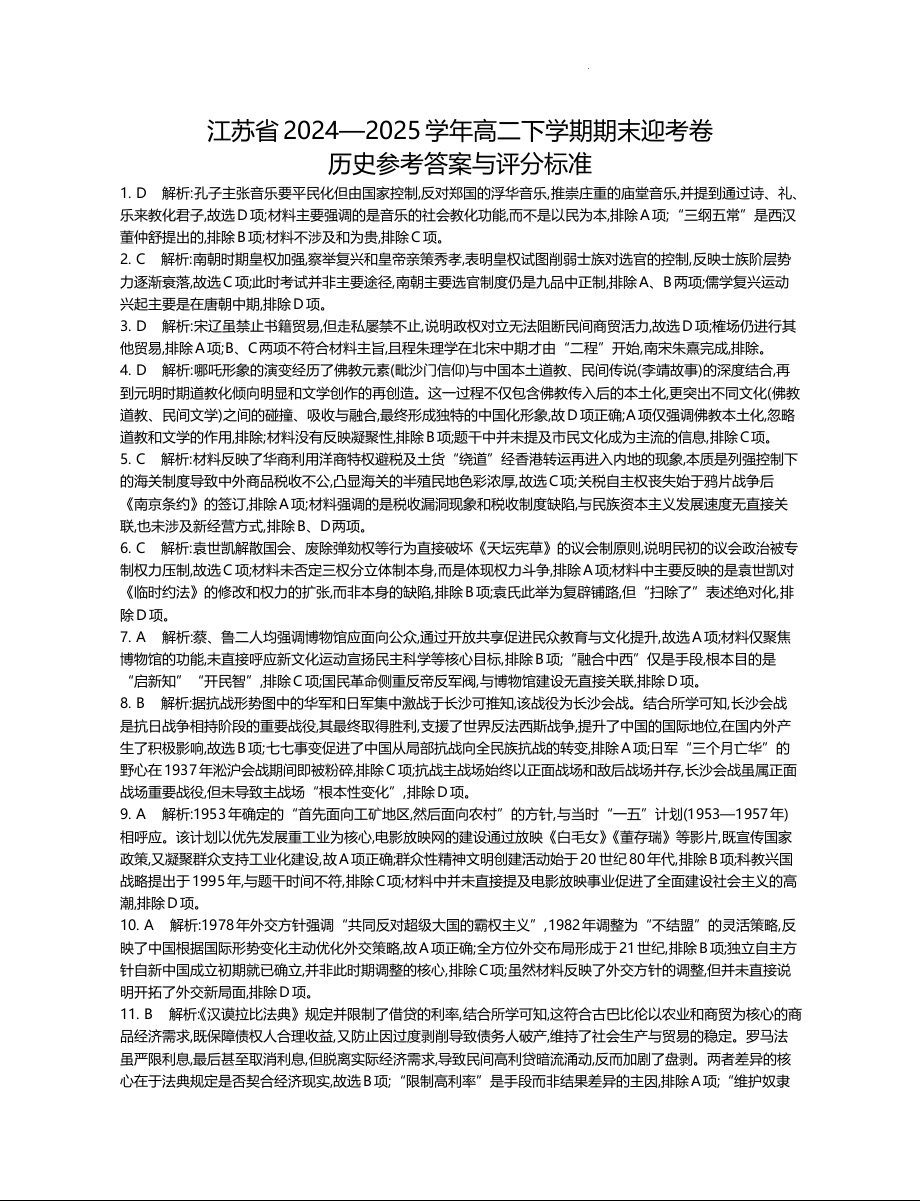 江苏省部分高中2024-2025学年下学期高二期末迎考历史答案