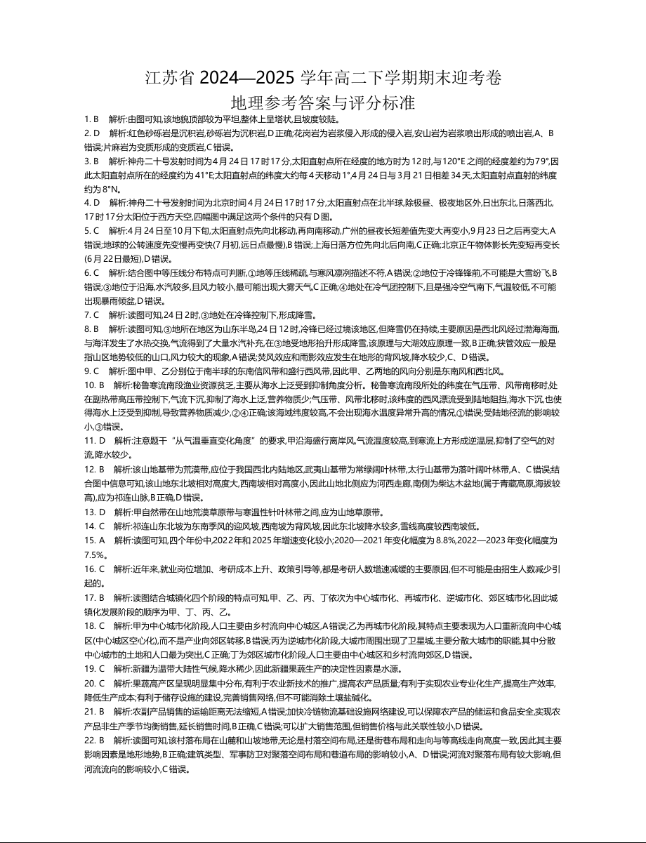江苏省部分高中2024-2025学年下学期高二期末迎考地理答案