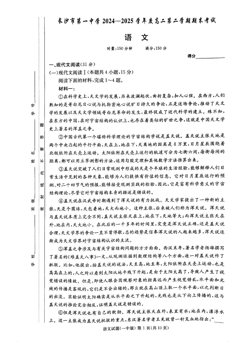 湖南省长沙市一中2024-2025学年下学期6月高二期末语文+答案