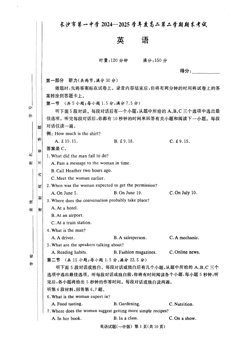 湖南省长沙市一中2024-2025学年下学期6月高二期末英语+答案