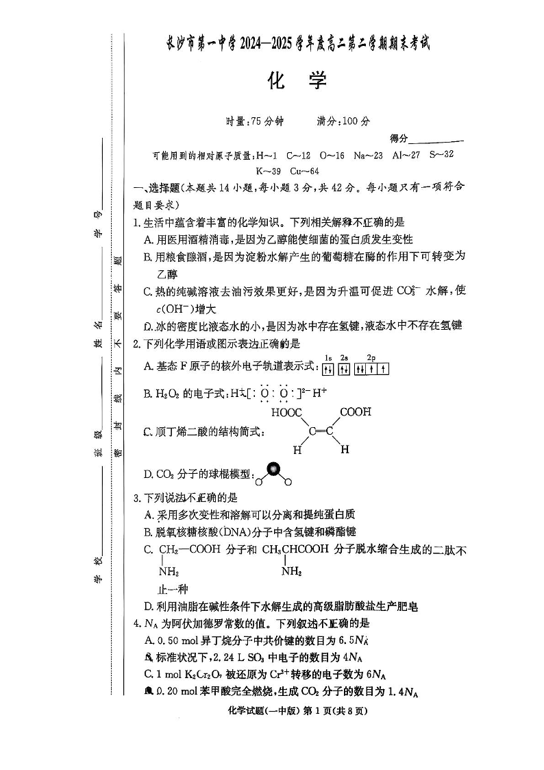 湖南省长沙市一中2024-2025学年下学期6月高二期末化学+答案