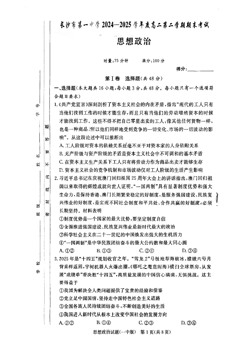 湖南省长沙市一中2024-2025学年下学期6月高二期末政治+答案