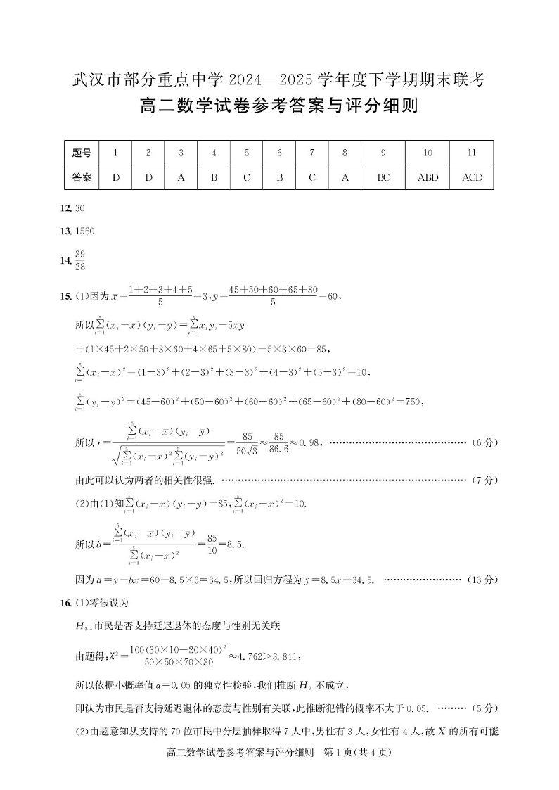 湖北省武汉市部分重点中学2024-2025学年下学期高二期末联考数学答案