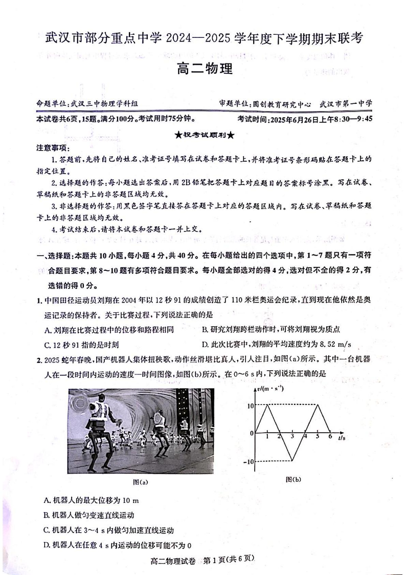湖北省武汉市部分重点中学2024-2025学年下学期高二期末联考物理