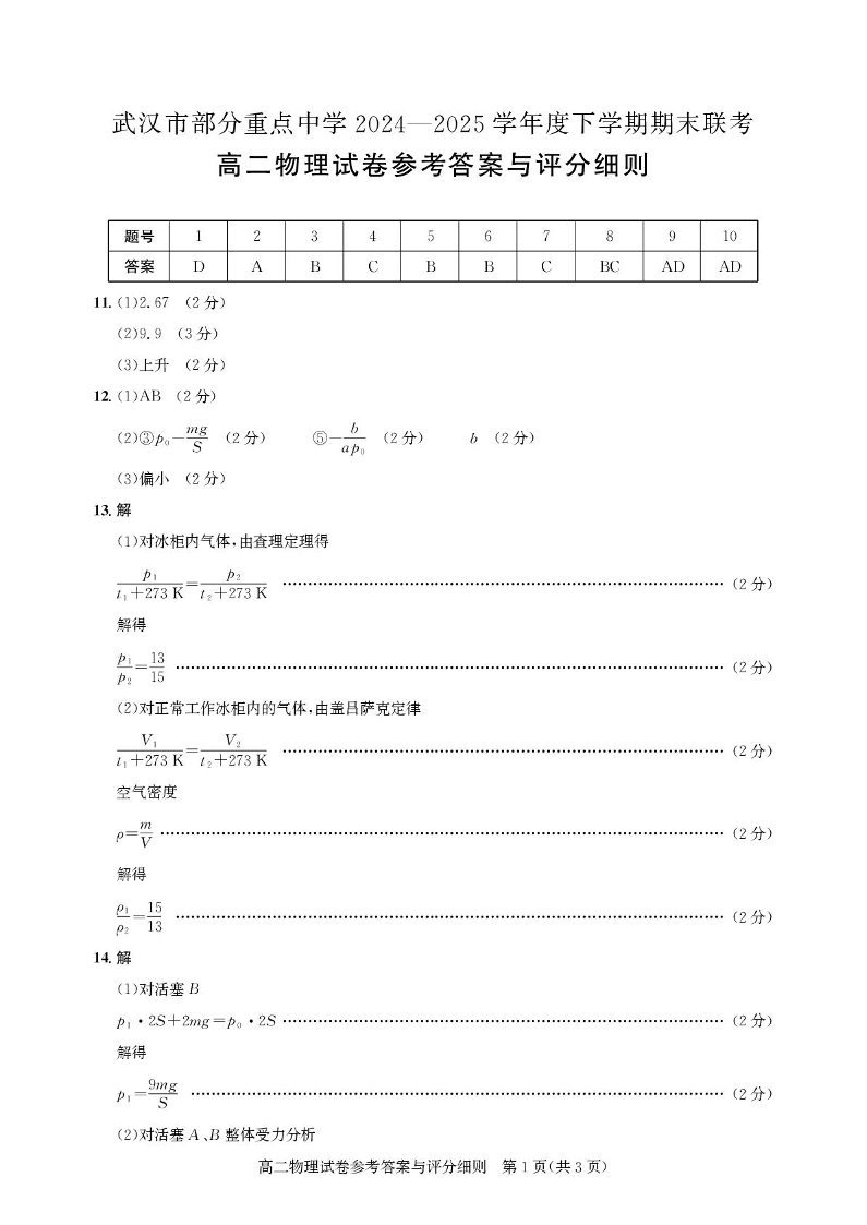 湖北省武汉市部分重点中学2024-2025学年下学期高二期末联考物理答案