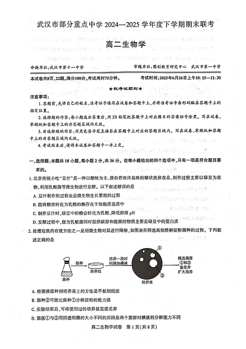 湖北省武汉市部分重点中学2024-2025学年下学期高二期末联考生物+答案