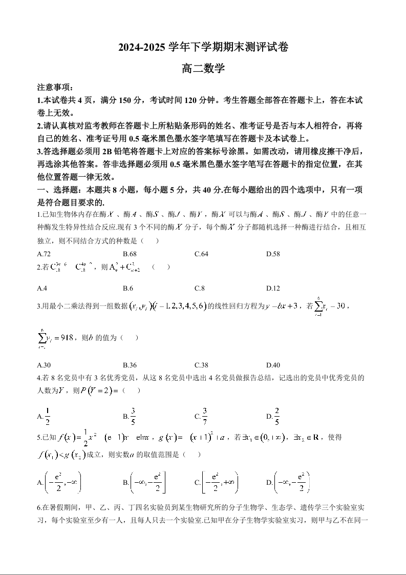 河南省2024-2025年6月高二期末测评数学+答案