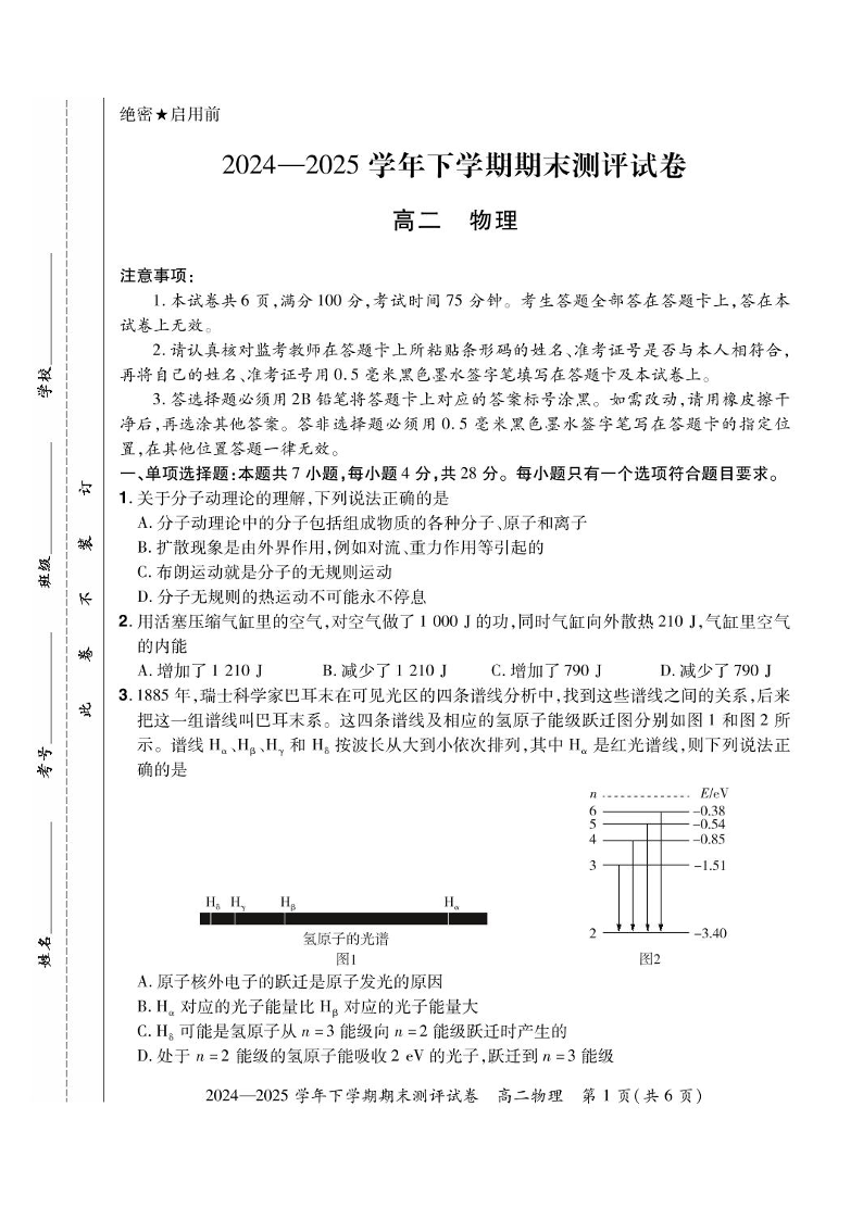 河南省2024-2025年6月高二期末测评物理+答案