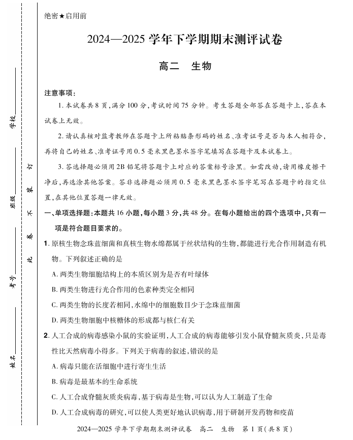 河南省2024-2025年6月高二期末测评生物