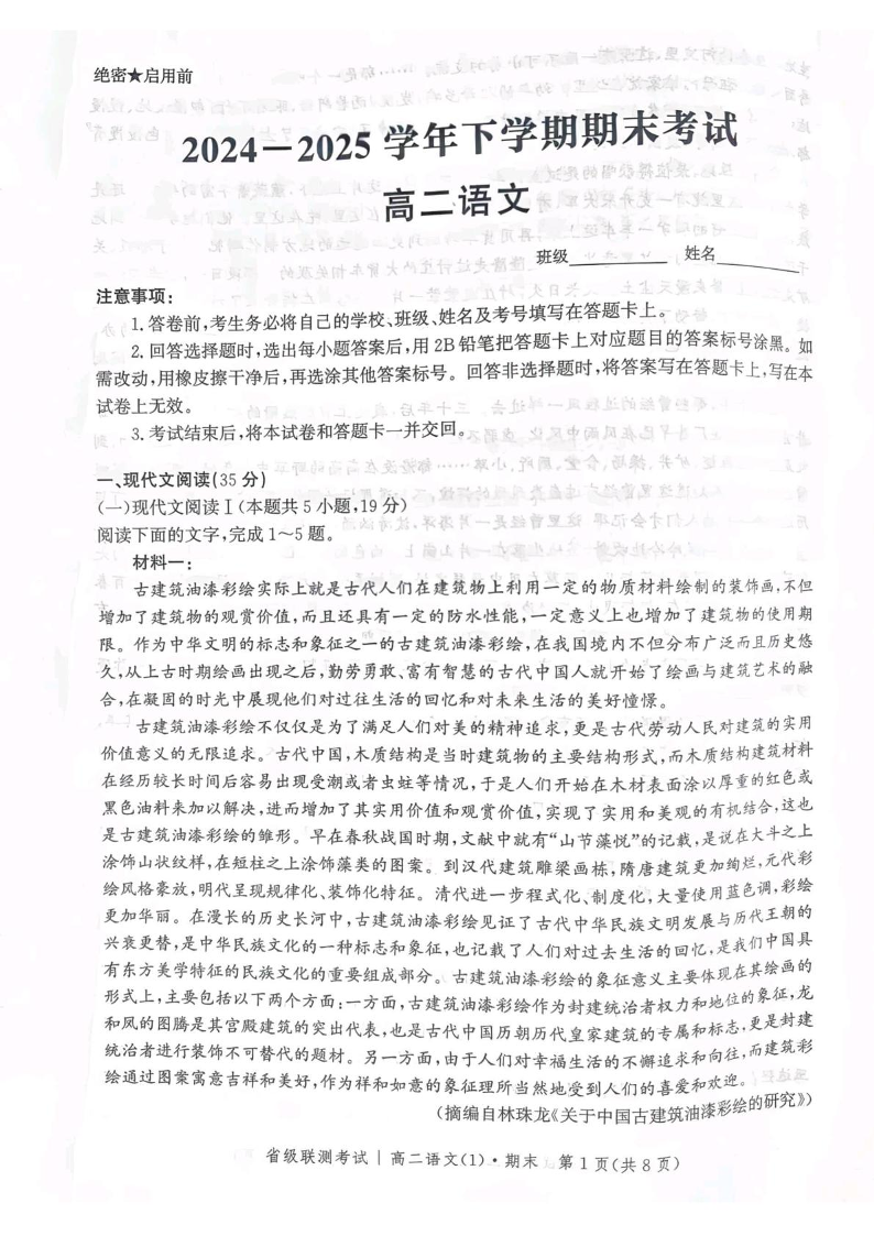 河北省省级联测2024-2025学年高二下学期6月期末考试语文+答案