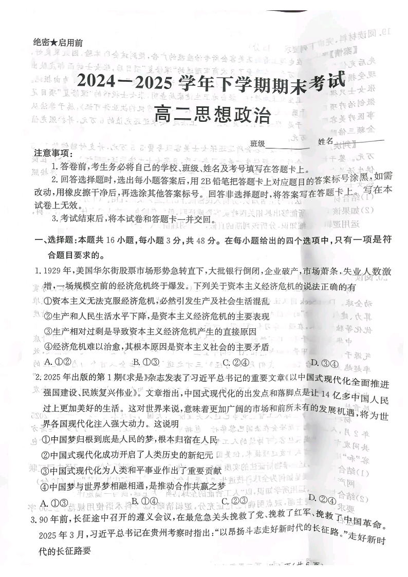 河北省省级联测2024-2025学年下学期6月高二期末考试政治