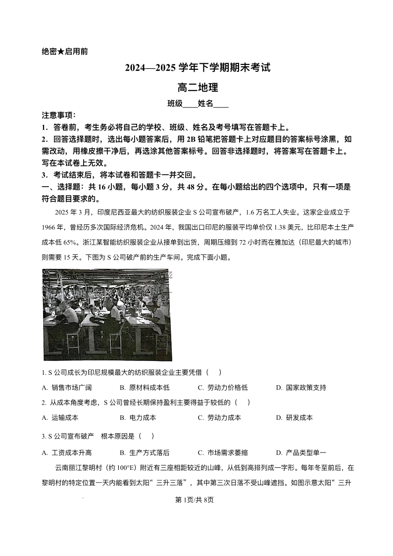 河北省省级联测2024-2025学年下学期6月高二期末考试地理+答案