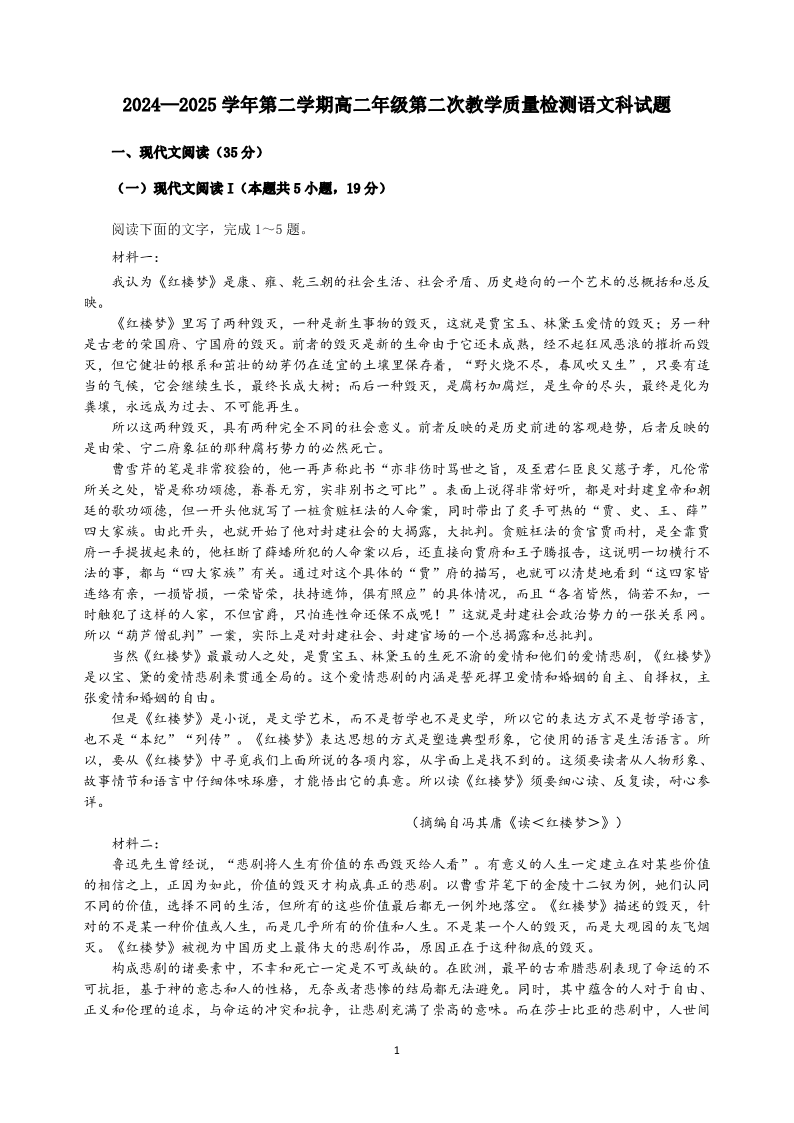 广东省肇庆市四校2024-2025学年高二下学期第二次教学质量检测语文+答案