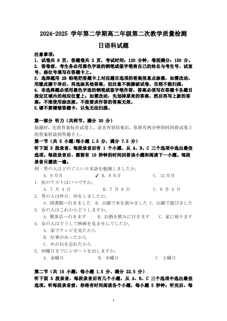 广东省肇庆市四校2024-2025学年高二下学期第二次教学质量检测日语+答案