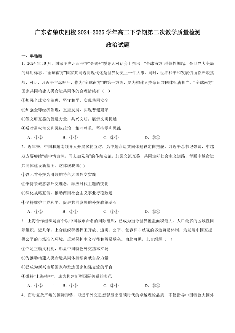 广东省肇庆市四校2024-2025学年高二下学期第二次教学质量检测政治+答案