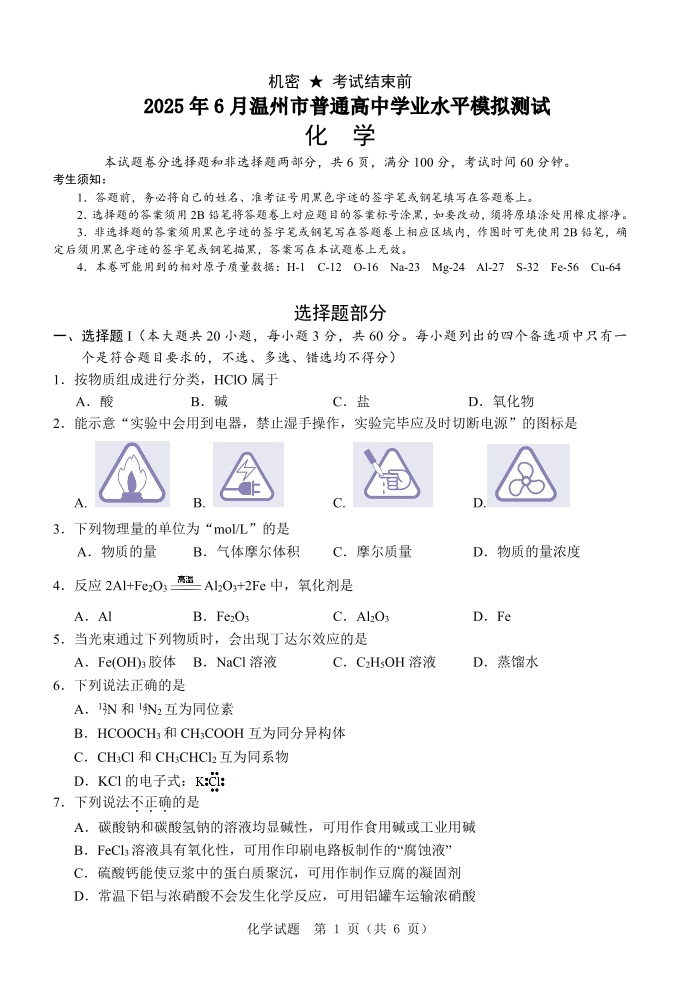 浙江省温州市2025年6月高一学业水平模拟考试化学