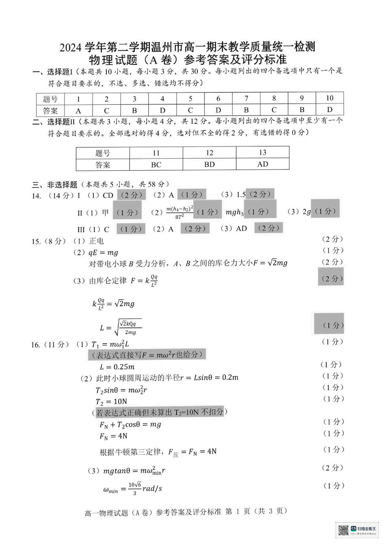 浙江省温州市2024-2025学年下学期6月高一期未物理答案