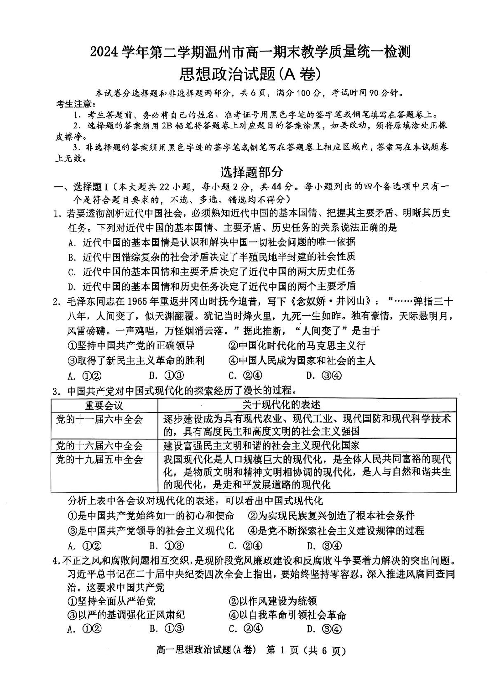浙江省温州市2024-2025学年下学期6月高一期未政治