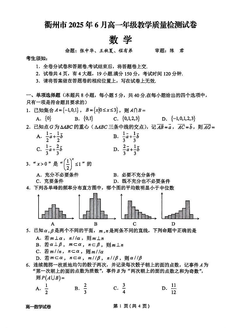 浙江省衢州市2024-2025学年下学期6月高一教学质量检测数学