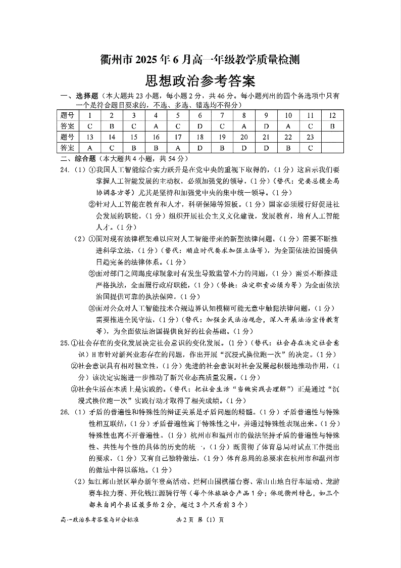 浙江省衢州市2024-2025学年下学期6月高一教学质量检测政治答案