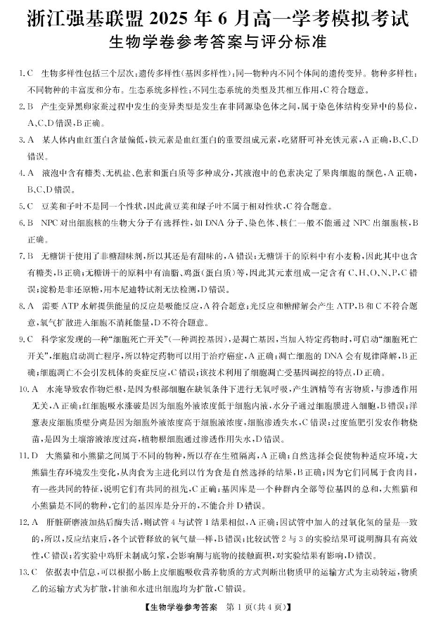 浙江省强基联盟学考模拟2024-2025学年下学期6月高一月考生物答案