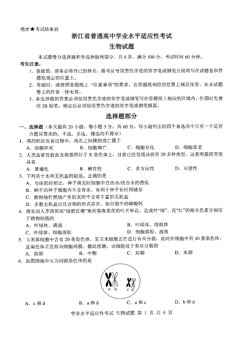 浙江省2025年6月高一学考模拟生物