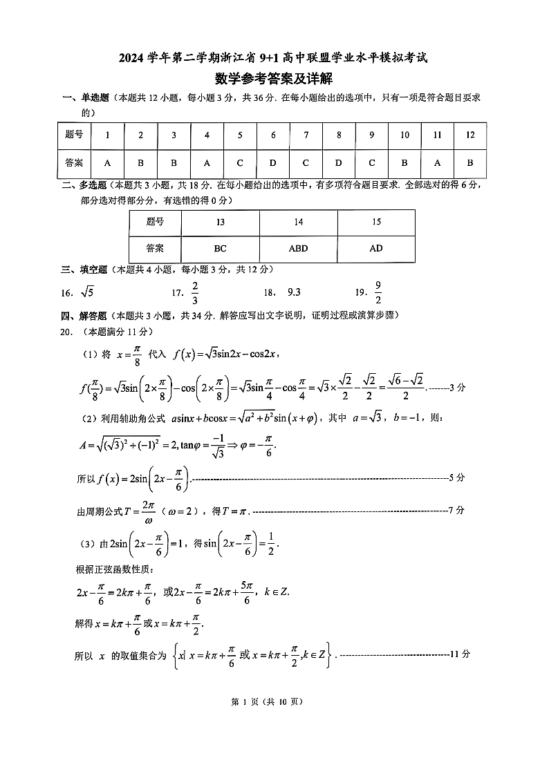 浙江省9+1高中联盟2024-2025学年下学期高一学业水平模拟考试数学答案