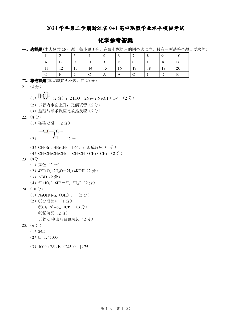 浙江省9+1高中联盟2024-2025学年下学期高一学业水平模拟考试化学答案